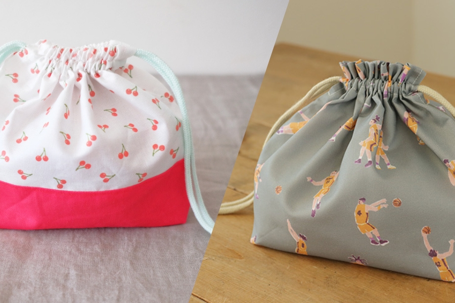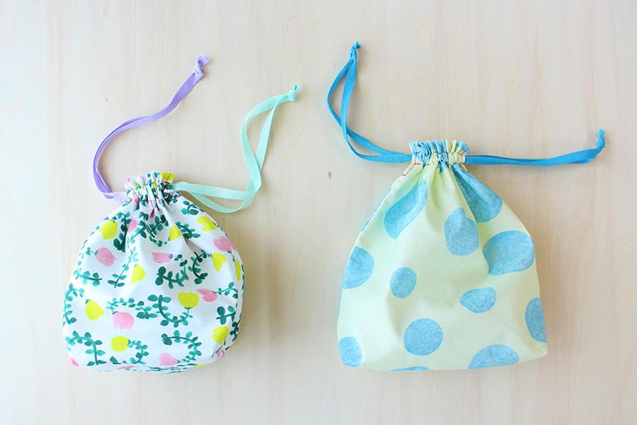 こちらも両サイドから紐を引いて口を閉じる巾着で作りました。