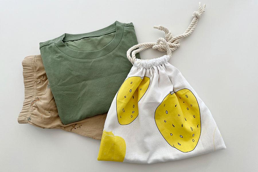 こちらもお着替え袋と同じく両サイドから紐を引いて口を閉じる巾着タイプです。